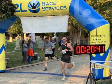 Ben Fithian (#506) crosses the finish line to lead GGDC's team to a second consecutive win in the Congressional Cemetery Dead Man's Run 5k.
